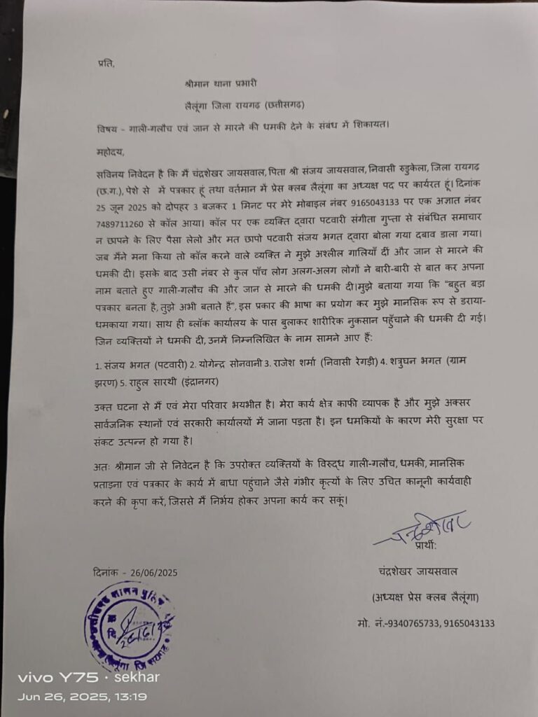 प्रेस की स्वतंत्रता और पत्रकारों की सुरक्षा पर गंभीर सवाल खड़ा करते हुए लैलूंगा में एक पत्रकार को लगातार धमकियां मिलने का मामला सामने आया है। पत्रकार चंद्रशेखर जायसवाल, जो प्रेस क्लब लैलूंगा के अध्यक्ष भी हैं, ने थाना लैलूंगा में शिकायत दर्ज कराते हुए बताया कि उन्हें पटवारी संगीता गुप्ता से संबंधित खबर न छापने के लिए एक अज्ञात नंबर से धमकी भरी कॉल आई।