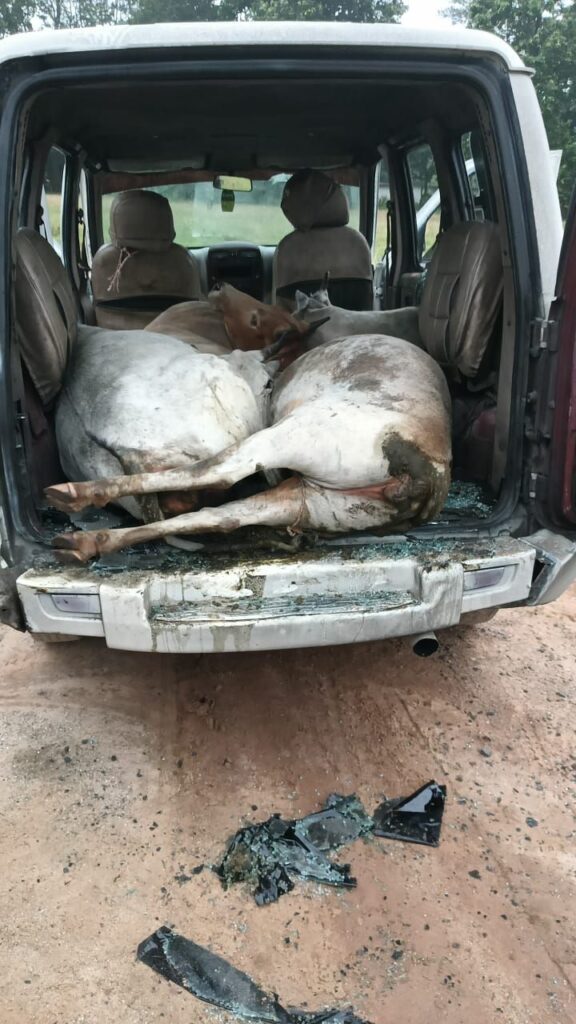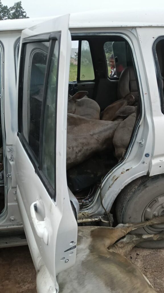 ➡️ पुलिस के टीम ने जब जब मायली के पत्थर खदान रोड पर जाकर देखा तो वहां पर संदिग्ध सफेद रंग की स्कॉर्पियो वाहन क्रमांक CG-13C-1151 खड़ी थी, जिसमें कोई व्यक्ति नहीं था, पुलिस ने जब स्कॉर्पियो वाहन को चेक किया, उसके पीछे की सीट को निकाल कर 05 नग गौ वंशों को रस्सी से बांधकर, बेरहमी पूर्वक ठूंस ठूंस कर भरा गया था। पुलिस के द्वारा सभी 05 नग गौ वंशों को सकुशल बरामद कर, उनका पशु चिकित्सक से स्वास्थ्य परीक्षण भी कराया गया है। व फरार आरोपियों के संबंध में आस पास के ग्रामों में पता साजी की जा रही है। व गाड़ी नंबर के संबंध पुलिस की जांच जारी है, जिसके आधार पुलिस आरोपी तस्करों तक पहुंचने का प्रयास कर रही है।