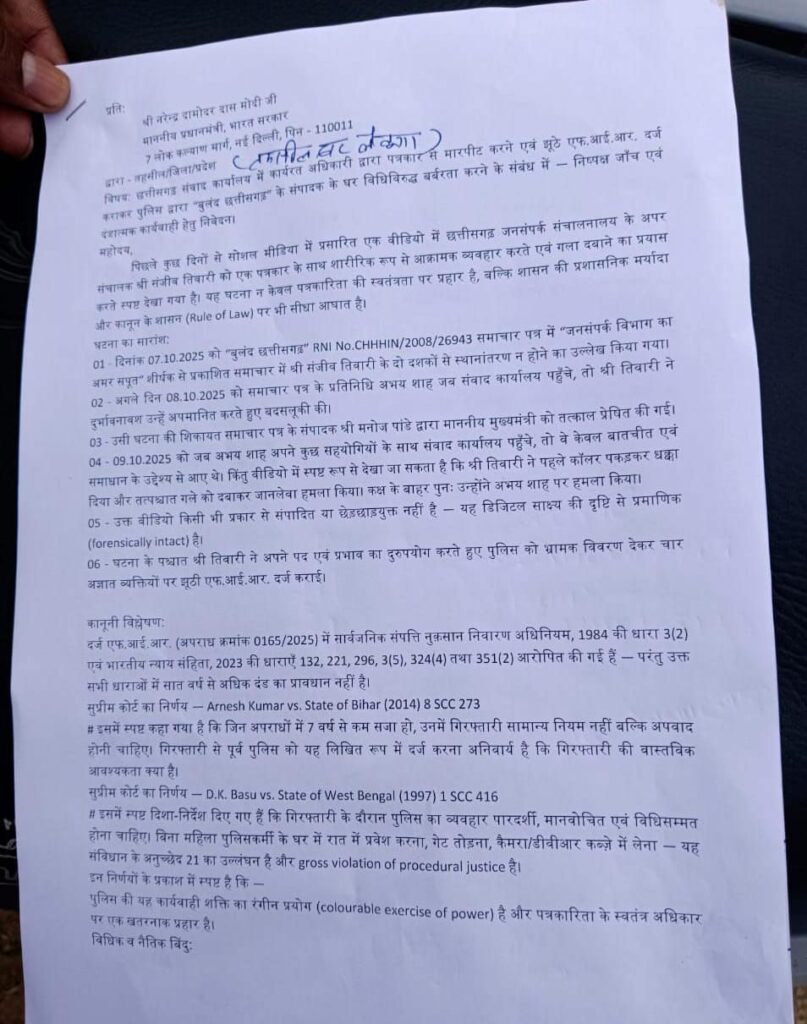 *लैलूंगा : रायपुर में पत्रकार पर हमले के विरोध में प्रेस क्लब काआक्रोश प्रधानमंत्री को ज्ञापन, जनसंपर्क अधिकारी संजीव तिवारी पर आपराधिक कार्रवाई की मांग…* *लैलूंगा।* छत्तीसगढ़ की पत्रकारिता जगत में भारी आक्रोश फैल गया है। राज्य के जनसंपर्क संचालनालय में पदस्थ अपर संचालक श्री संजीव तिवारी द्वारा पत्रकार अभय शाह के साथ की गई मारपीट, गला दबाने के प्रयास और दुराचारपूर्ण व्यवहार की वायरल वीडियो घटना ने मीडिया और प्रशासनिक हलकों में गहरी चिंता पैदा कर दी है। इसी संदर्भ में प्रेस क्लब लैलूंगा ने प्रधानमंत्री श्री नरेन्द्र दामोदर दास मोदी के नाम ज्ञापन सौंपकर निष्पक्ष जांच, दोषी अधिकारी के विरुद्ध दंडात्मक कार्यवाही, और पत्रकारों की सुरक्षा के लिए ठोस नीति निर्माण की मांग की है। ज्ञापन लैलूंगा तहसीलदार को सौंपा गया, जिसकी प्रतिलिपि गृह मंत्री, भारत सरकार, मुख्यमंत्री छत्तीसगढ़, गृह मंत्रालय, तथा डीजीपी छत्तीसगढ़ को भी प्रेषित की गई है। *घटना का पृष्ठभूमि :* ज्ञापन के अनुसार, 7 अक्टूबर 2025 को “बुलंद छत्तीसगढ़” समाचार पत्र में एक रिपोर्ट प्रकाशित हुई थी जिसका शीर्षक था – “जनसंपर्क विभाग का अमर सपूत”। रिपोर्ट में यह उल्लेख किया गया था कि श्री संजीव तिवारी पिछले दो दशकों से एक ही पद पर बने हुए हैं, जो शासन के सामान्य स्थानांतरण नियमों के विपरीत है। अगले ही दिन, 8 अक्टूबर को, संवाददाता अभय शाह जब संवाद कार्यालय पहुँचे, तो श्री तिवारी ने दुर्व्यवहार और अपमानजनक भाषा का प्रयोग किया। 9 अक्टूबर को जब अभय शाह अपने सहयोगियों के साथ पुनः संवाद कार्यालय पहुँचे, तो उन्होंने किसी प्रकार का प्रदर्शन नहीं किया, बल्कि बातचीत के लिए पहुंचे थे। लेकिन वहां श्री तिवारी ने पहले कॉलर पकड़कर धक्का दिया, फिर गला दबाने का प्रयास किया, और कार्यालय के बाहर भी उन्हें शारीरिक रूप से आक्रामक व्यवहार का सामना करना पड़ा। इस पूरे घटनाक्रम का वीडियो सोशल मीडिया पर वायरल है, जिसमें पूरा दृश्य साफ-साफ देखा जा सकता है। प्रेस क्लब ने ज्ञापन में कहा है कि उक्त वीडियो असंपादित, प्रामाणिक और फॉरेंसिक रूप से सुरक्षित (forensically intact) है। *झूठी एफ.आई.आर. और पुलिस की बर्बरता का आरोप :* घटना के बाद श्री तिवारी ने अपने प्रभाव का दुरुपयोग करते हुए रायपुर कोतवाली थाने में झूठी एफ.आई.आर. (क्रमांक 0165/2025) दर्ज करवाई, जिसमें चार अज्ञात व्यक्तियों को अभियुक्त बताया गया। एफ.आई.आर. में भारतीय न्याय संहिता (BNS) की धाराएँ 132, 221, 296, 324(4), 351(2) और सार्वजनिक संपत्ति नुकसान निवारण अधिनियम की धारा 3(2) लगाई गईं – जबकि इनमें किसी में भी 7 वर्ष से अधिक की सजा का प्रावधान नहीं है। इसके बावजूद, रायपुर पुलिस ने रात 1:37 बजे पत्रकार मनोज पांडे के घर गेट तोड़कर जबरन प्रवेश किय