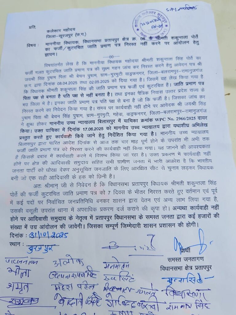 छत्तीसगढ़ के प्रातापपुर विधानसभा क्षेत्र की विधायक श्रीमती शकुंतला सिंह पोर्ते का जाति प्रमाणपत्र कथित रूप से फर्जी व कुट–रचित बताते हुए क्षेत्र में राजनीतिक और सामाजिक विवाद गहराता जा रहा है। आदिवासी समाज ने प्रमाणपत्र रद्द करने की मांग उठाई है और प्रशासन पर कार्रवाई के लिए दबाव बना दिया है।