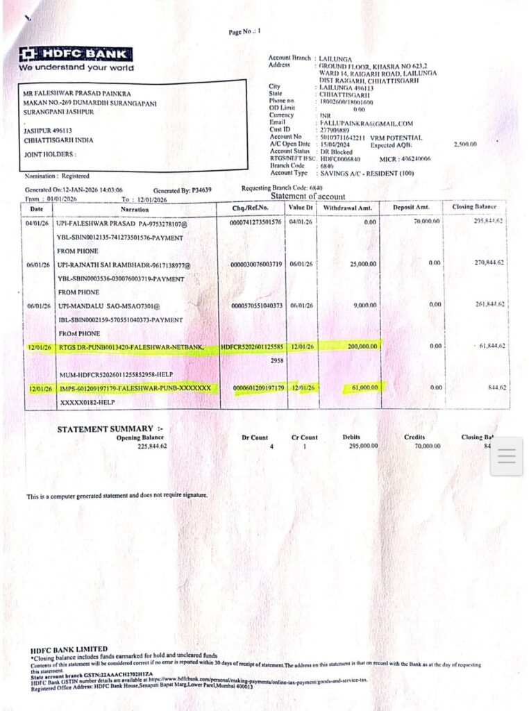 प्राप्त जानकारी के अनुसार, पीड़ित खाताधारक के HDFC बैंक खाता क्रमांक 50100711642211 से दिनांक 12 जनवरी 2026 को सुबह लगभग 9:13 बजे बिना उसकी जानकारी और अनुमति के दो अलग-अलग ऑनलाइन ट्रांजेक्शन के माध्यम से भारी राशि निकाल ली गई।